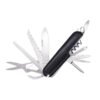 multitool that has a total of 17 functions including: slotted screwdriver, bottle opener, key ring, knife, saw, hook remover, fish scaler, scissors, can opener, corkscrew, needle, nail file, nail cleaner, leather punch, phillips screwdriver, toothpick, and tweezers. Packed in a gift box
