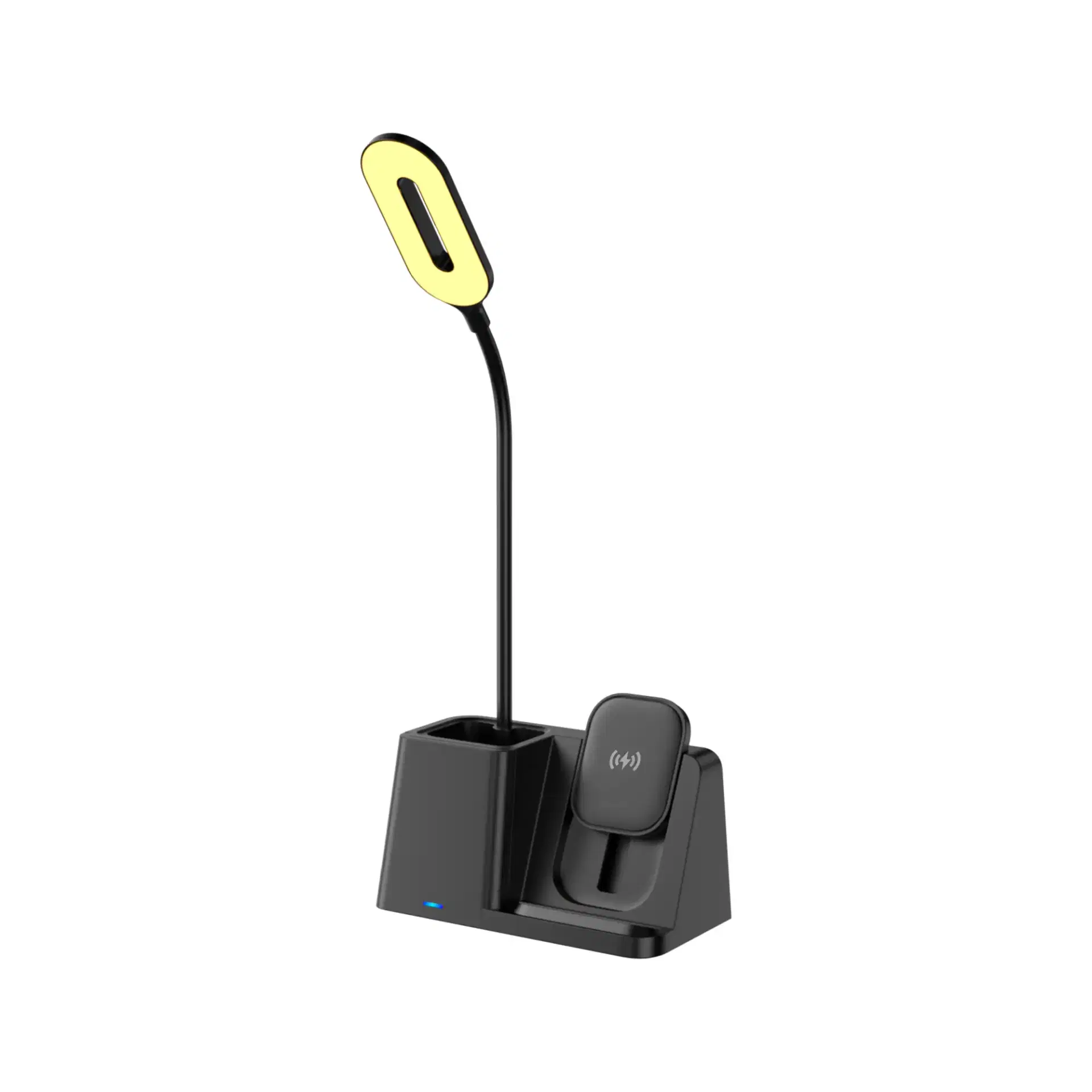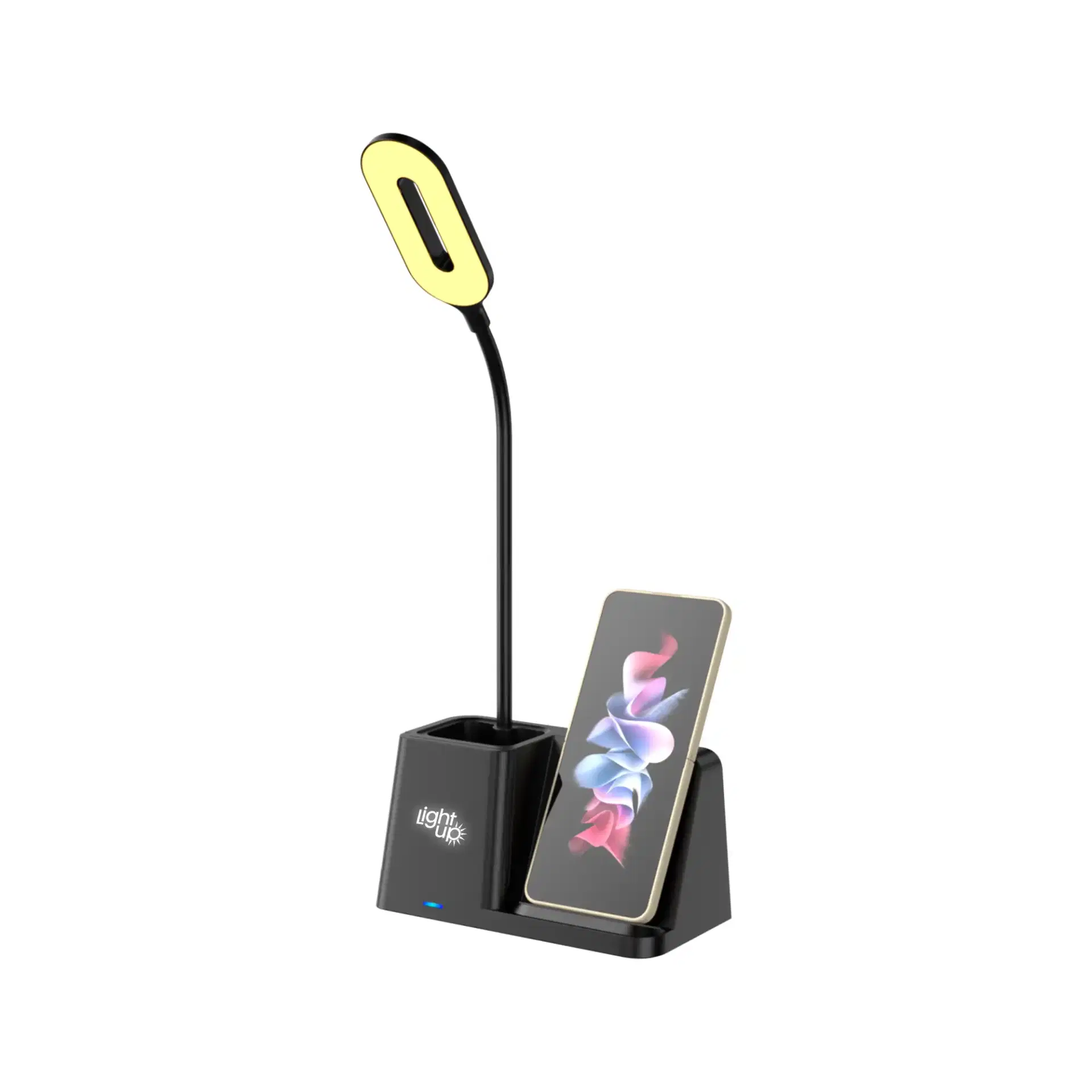 Combines a 15W fast wireless charger, LED desk lamp, and pen holder with a customizable light-up logo.