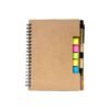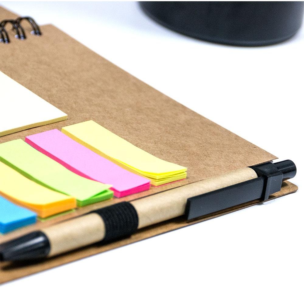 Stay organized and eco-conscious with this versatile A5 notebook. It comes equipped with a recycled-paper cover, a ballpoint pen, and a set of vibrant sticky notes for easy marking or highlighting. The spiral-bound design ensures easy page turning, while the compact size makes it ideal for travel, meetings, or everyday use. Perfect for students, professionals, and anyone who loves an organized workspace, this notebook is a practical addition to your stationery collection. The natural, brown cover adds a minimalist touch, blending functionality with style. 4o