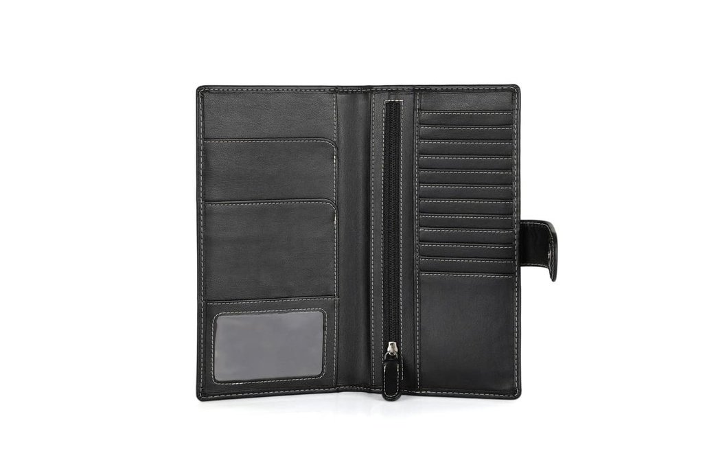 Contains numerous organizational features such as zipper coin pocket, cash pocket, 12 card slots, 1 ID window slot and a passport compartment. Cactus leather is a highly sustainable plant-based alternative to genuine leather.