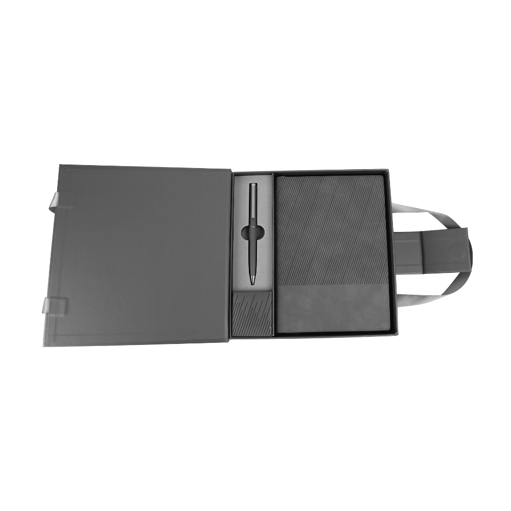 Inside, it includes an A5 notebook with 80 sheets of 100 GSM paper and a matching metal pen, both available in Blue, Grey, or Black.