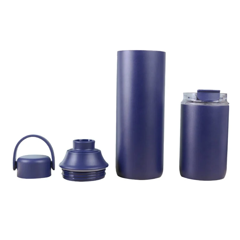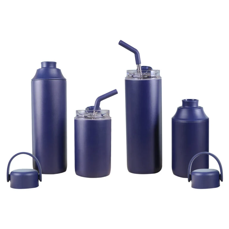 A set of powder coated cups in 600ml and 300ml with interchangeable lids of either a clear press-in lid or a mouth piece lid with an adjustable SS straw and a food grade silicon straw cover. Double wall flasks with SS inside.