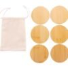 Set of 6 circular natural bamboo coasters, each measuring 8.5 cm in diameter and 0.5 cm in thickness. Packed in a cotton drawstring pouch
