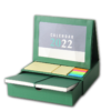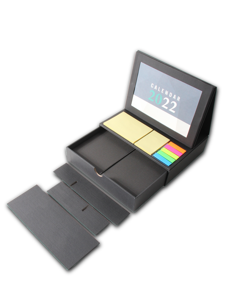 A perfect desktop gift that has a frame with 13 sheets calendar on it and a 4cm height drawer with finger hole to open from front side. Drawer comes with A5 Soft PU Lined notebook 100 sheets and 1.5cm velvet EVA foam where you can do diecut for the items that you want to add. It also includes 2 dividers that you can use as separator in the drawer turned storage. It has yellow sticky note: 10 x 7.6cm & 5 x 7.6 cm (25 sheets each pad), 5 colors PET Flag: 1.2 x 4.5 cm(25 sheets each pad).