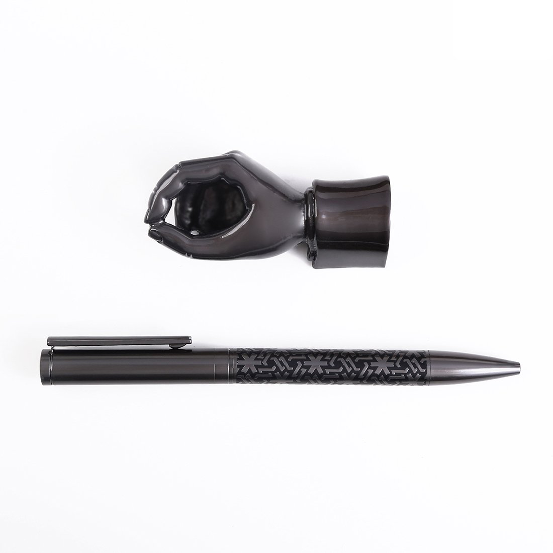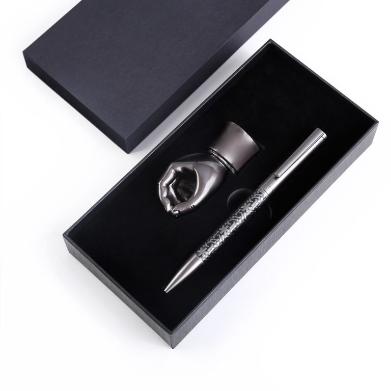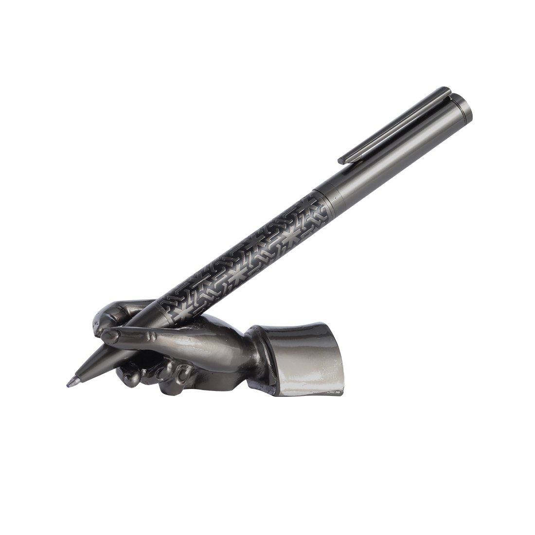 Twist pen with hand shaped holder with brass material pen stand, finishing is mainly made from matte black chrome plated. Brass pen with an iron clip. Etched middle barrel has finish material of matte black chrome plated w/black lacquered. Rest of pen parts has finishing of matte black chrome plated. Parker type ballpoint blue ink refill.