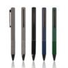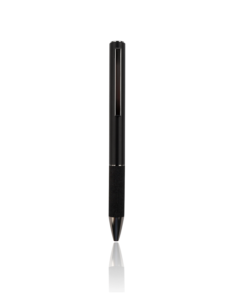 Metal with a recycled PU material in the lower body and paint coated on the clip part. Underneath is a chrome plating for engraving effect.
