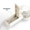 Compact, lightweight portable hand fan in white, made from durable ABS plastic. Powered by 2 × AAA batteries, the fan delivers reliable single-speed airflow via a 130 motor (2W output, 0.5A).