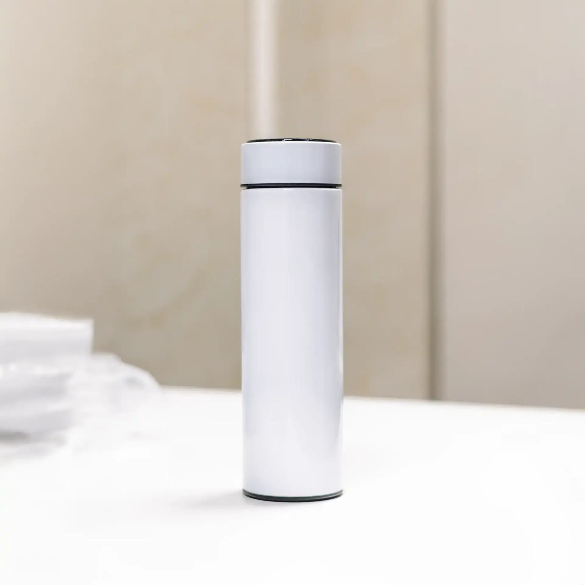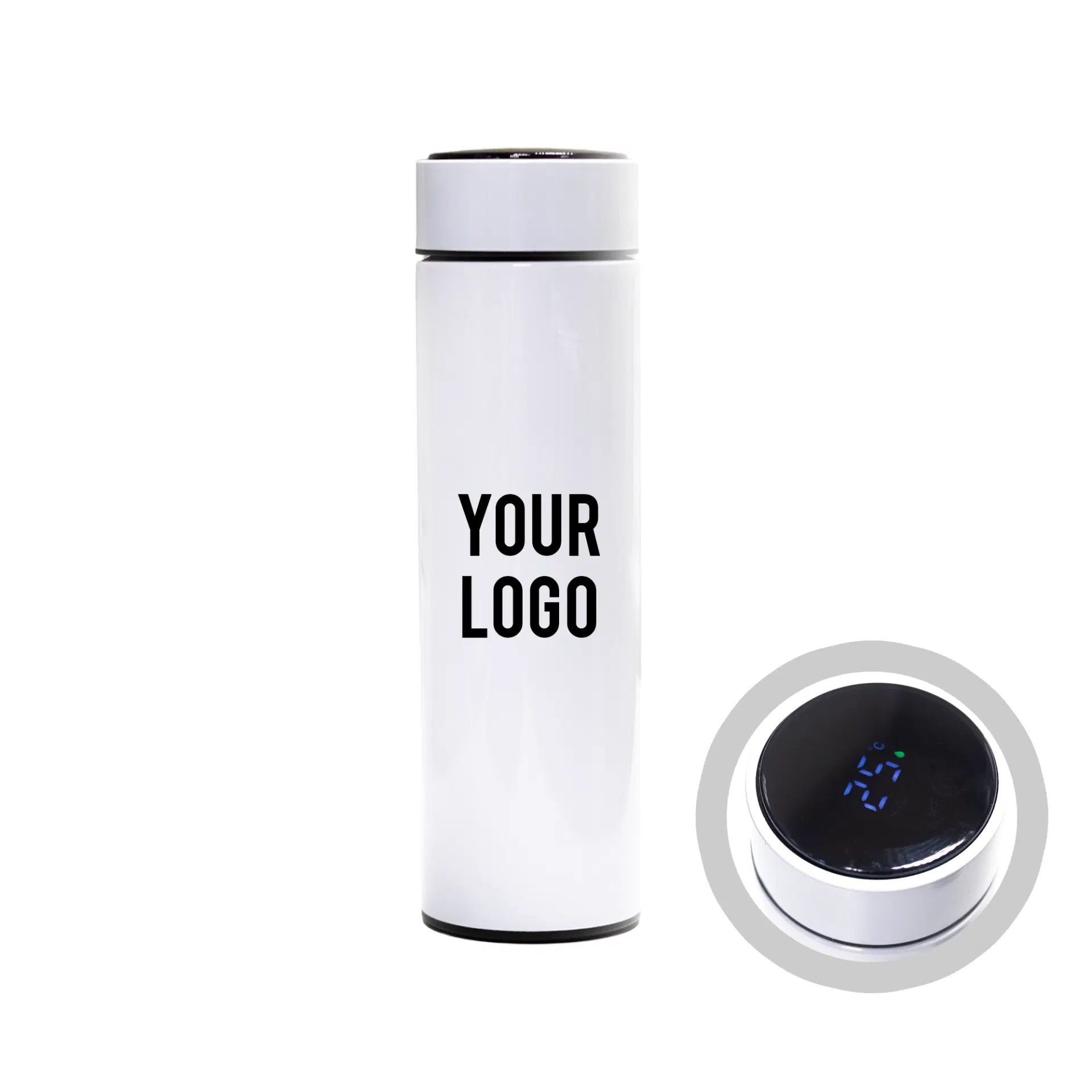 A premium stainless-steel insulated bottle with a smart LED temperature display on the lid. Designed in a clean white finish with double-wall insulation and a dedicated branding area for corporate logos.