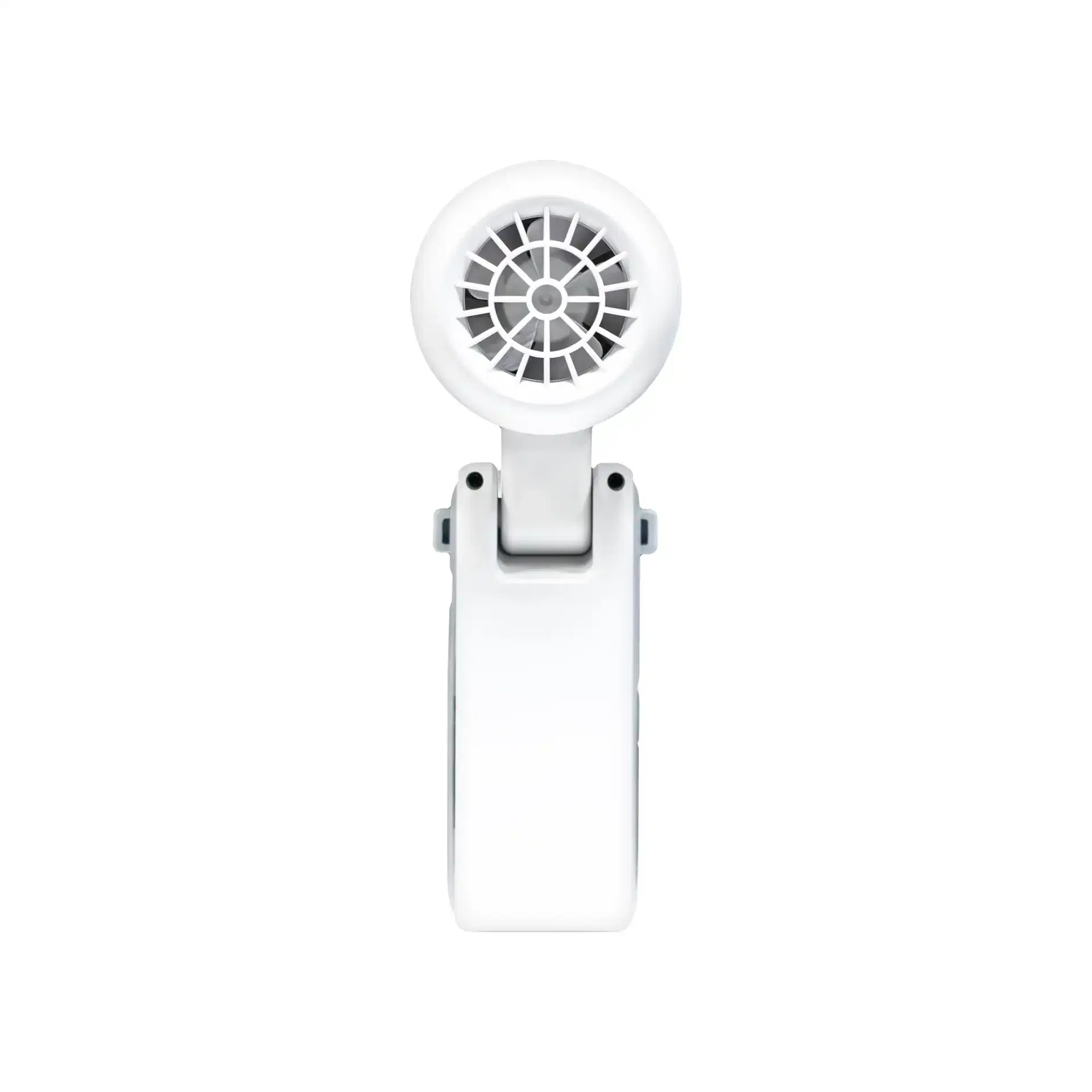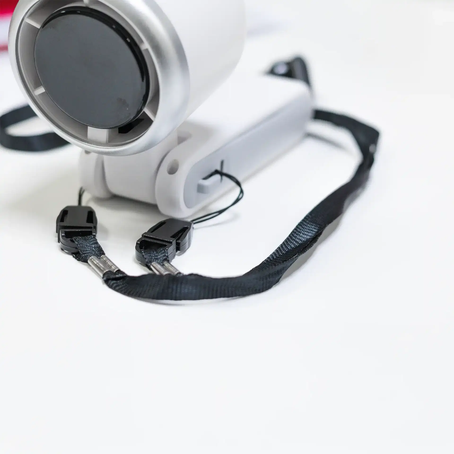 A sleek and portable rechargeable desk fan designed for everyday personal cooling. Features a modern circular display, adjustable airflow, and a customizable stand for logo branding.