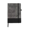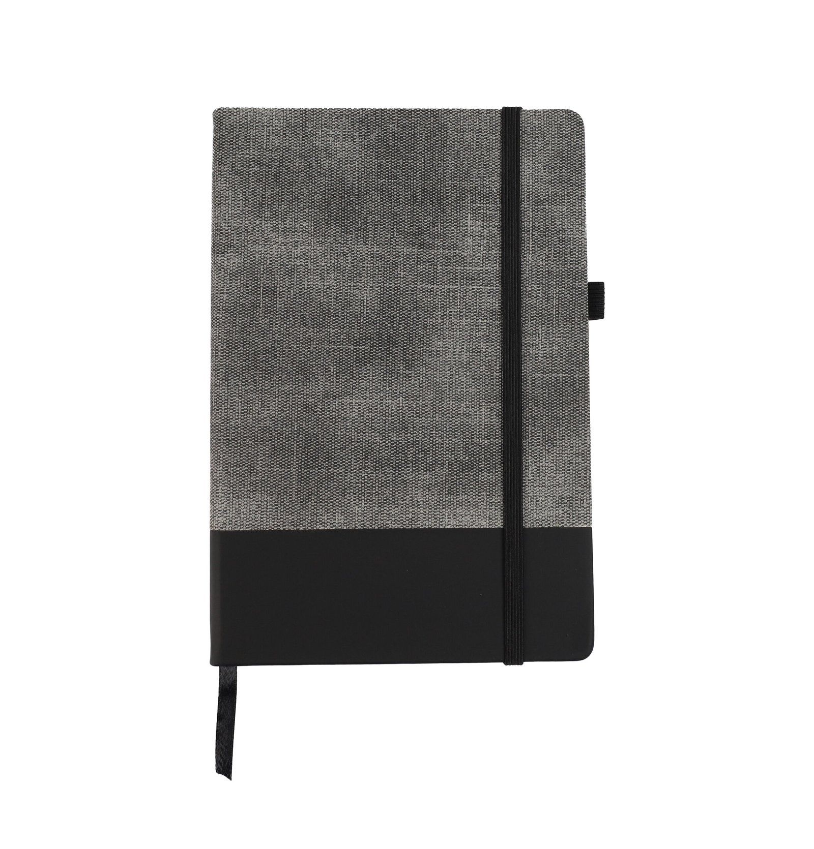 This A5-size notebook features 80 GSM paper with 80 sheets, measuring 14 x 20.6 cm. It includes a pen holder, a ribbon bookmark, a first information page, and comes in a brown sleeve.