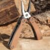 Strong and durable multitool with 13 functions. With beech wood case and high quality stainless steel tools. Tools include: Long nose plier, standard plier, wire cutters, serrated blade, bottle opener, large flat screwdriver, phillips screwdriver, knife, saw, small flat screwdriver, can opener, medium flat screwdriver, file. Packed in gift box.